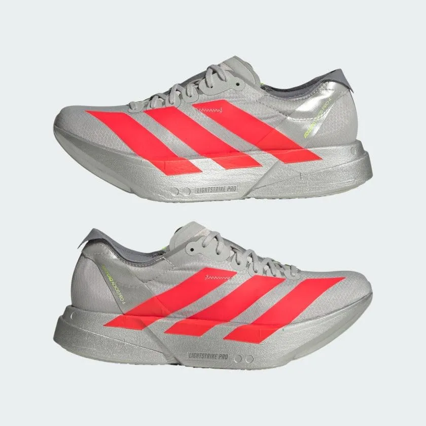 Proven to be the world's most winning shoe, the Adizero Adios Pro line is the pinnacle of Adizero Racing shoes. The Adios Pro 4 is made for fast runners who want to experience faster, with enhanced features designed to optimize running efficiency. Our carbon-infused ENERGYRODS 2.0 provide a seamless transition from heel to toe for a snappy, efficient stride. In the midsole, a new rocker point offers improved running economy. A double layer of our best-in-class ultralight LIGHTSTRIKE PRO ensures cushioning for every quick stride you take, helping you maintain energy over the long term. The shoe rides on an outsole built with Continental rubber for a no-slip transition during toe-off, as well as LIGHTTRAXION, designed to reduce weight without sacrificing grip.